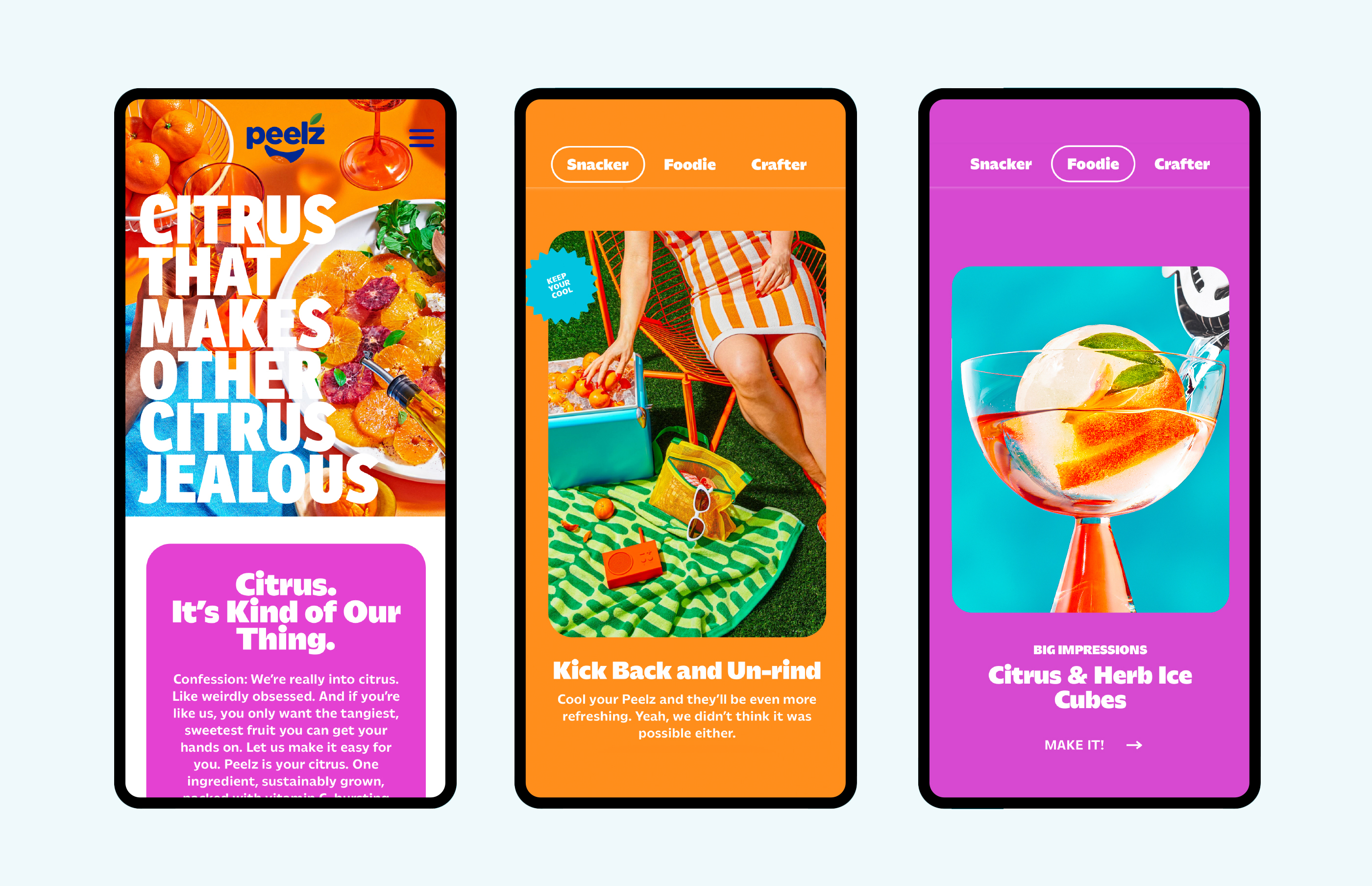 Best known for its mandarins, Peelz set out to build stronger notoriety and equity across its full citrus portfolio—shifting perception from a single standout commodity to a true category leader. In a space dominated by soft, cutesy cues, Peelz and its parent company, Fowler, bring an unapologetically bold, vibrant attitude. Our challenge was to express that confidence across packaging, website, and marketing—while remaining approachable, kid-friendly, and competitive in easy-peel mandarins, with healthful snacking benefits clearly communicated.
