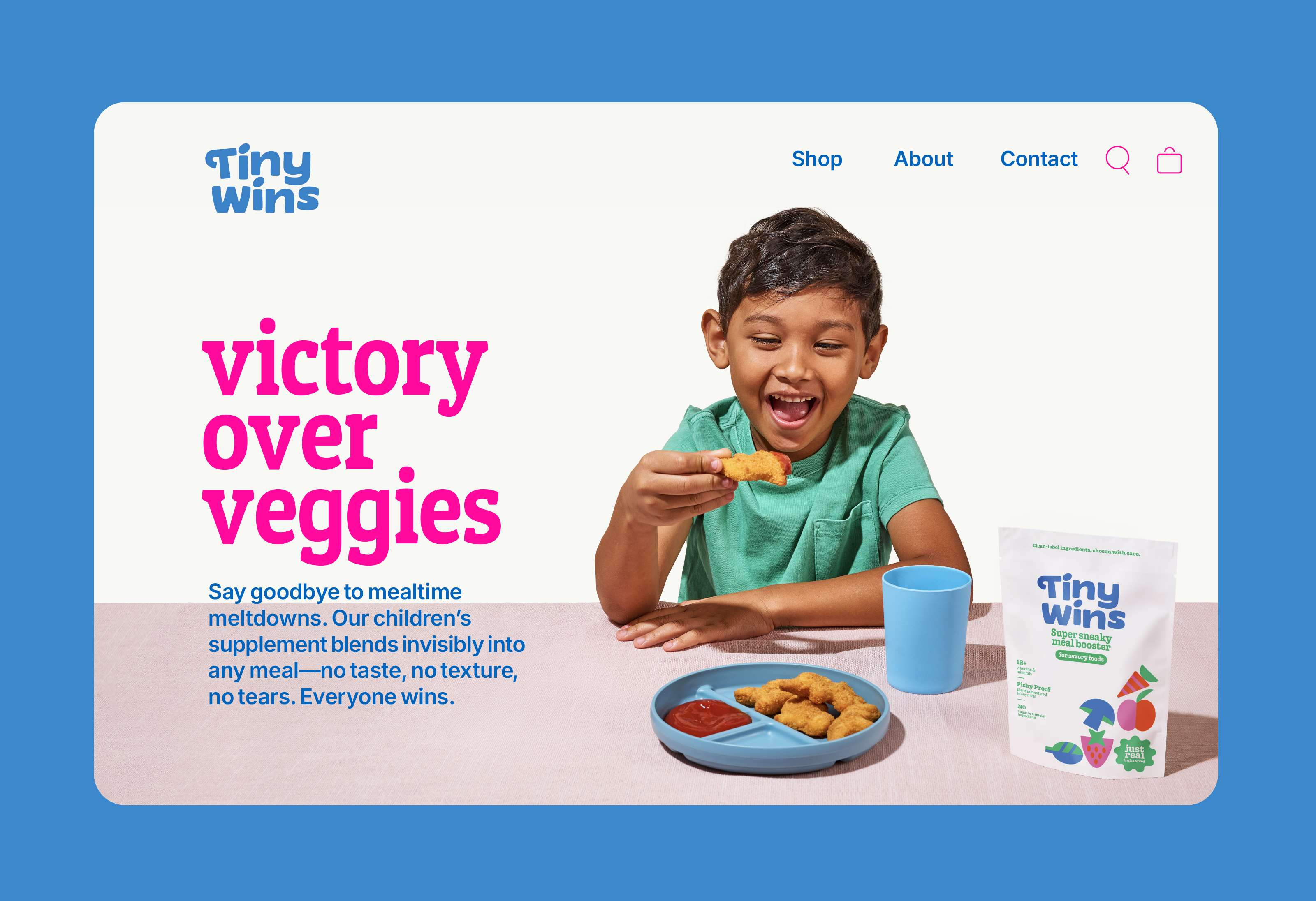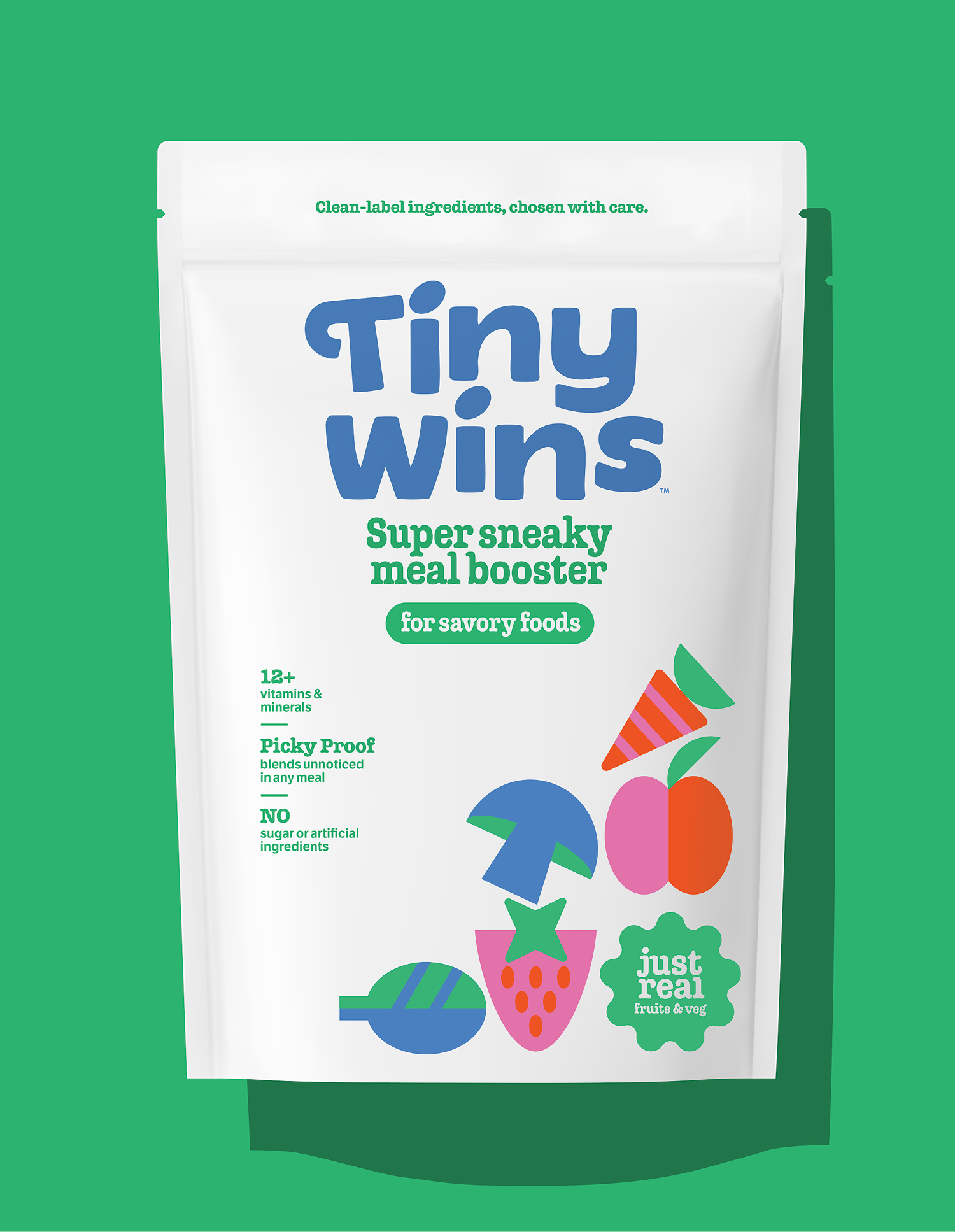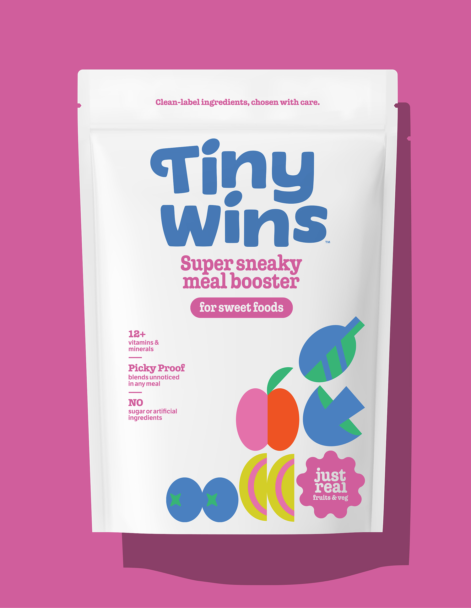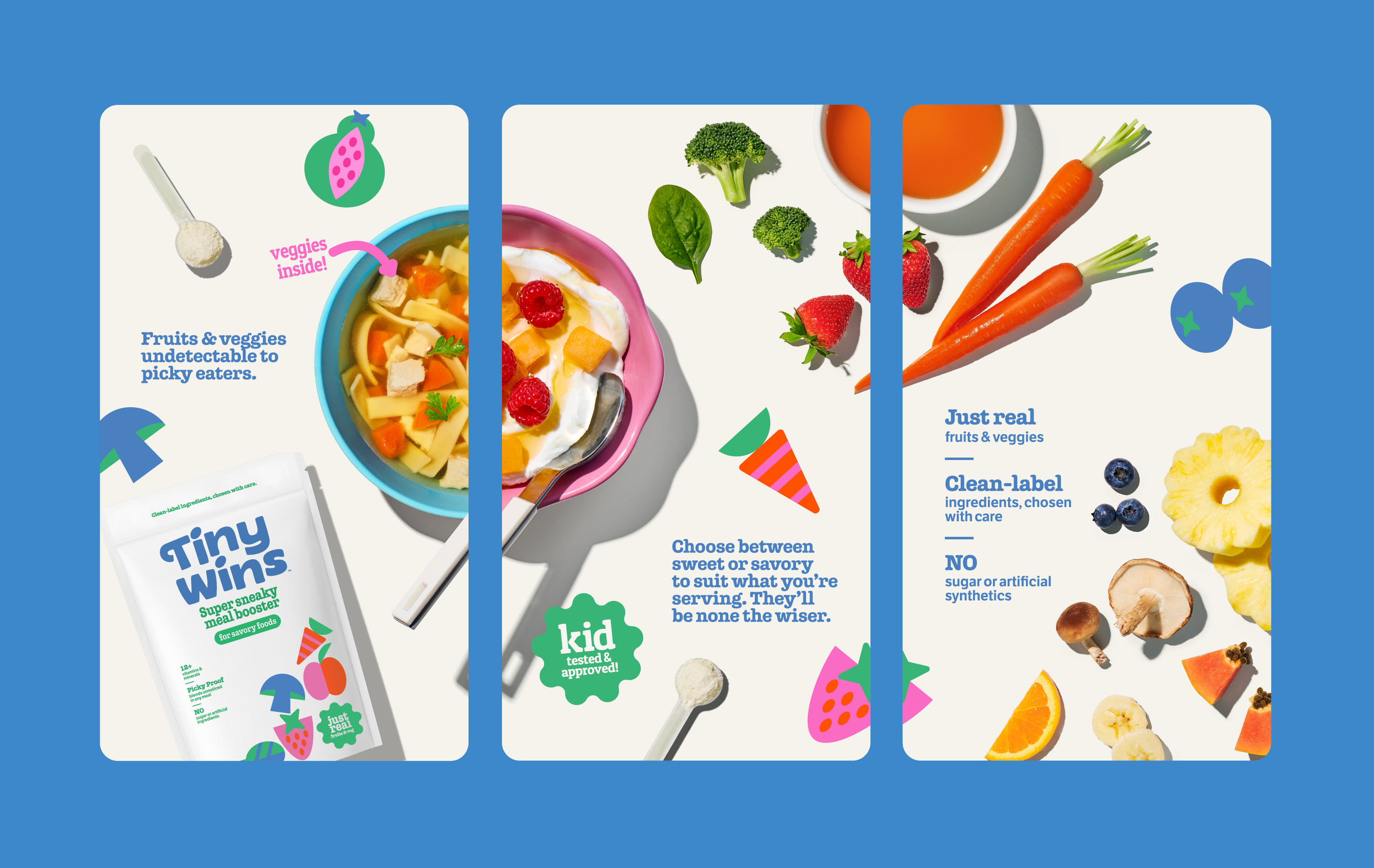 The name Tiny Wins was born to capture the emotional truth at the heart of the brand: every small step toward better nutrition is a win for a child’s future wellbeing. We brought that spirit to life through a custom wordmark full of personality and graphic illustrations that feel striking and meaningful—appealing equally to parents seeking reassurance and kids drawn to color and character. The tone of voice is smart, positive, and rooted in real-food credibility.
